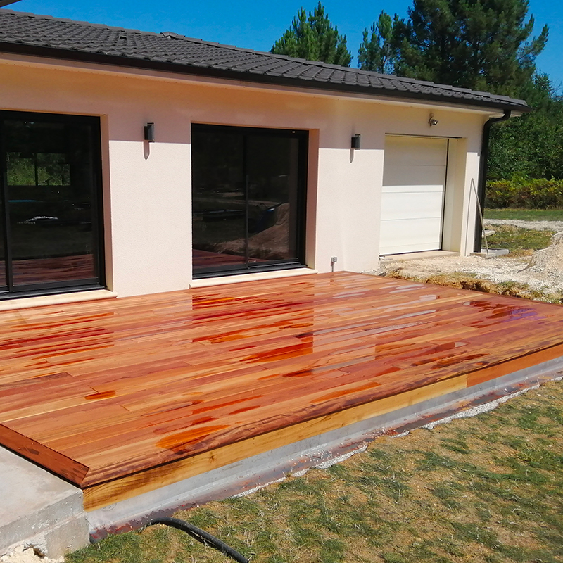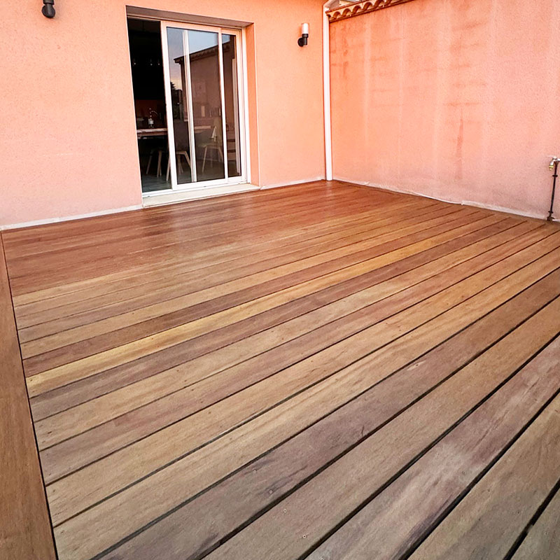 Réalisation d’une terrasse en bois exotique Terrasse bois exotique pour Hervé L. sur la commune de Saint Paul de Serre Terrasse en bois exotique, Muiracatiara « Tiger Wood », sur double lambourde en bois exotique et plots béton. Fixation par vis inox A2, apparentes. Finitions des bords de terrasse à l’aide d’une lame de terrasse et d’un pliage aluminium sur vide d’air. J’AI UN PROJET SIMILAIRE, ON EN PARLE !