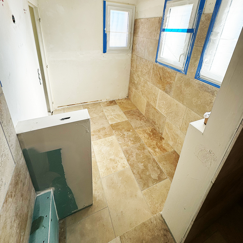 Rénovation d’une salle de bain Salle de bain – Travertin pour Nicolas L. à Chancelade Application d’un primaire d’accrochage sur l’ensemble, et d’un enduit d’étanchéité avec bandes armées dans la partie en eau. Pose de travertin, pierre naturelle, format 40 x 60 cm (colle blanche et joint de finition gris clair) Application d’une solution hydrofuge sur l’ensemble, aspect mat naturel. J’AI UN PROJET SIMILAIRE, ON EN PARLE !
