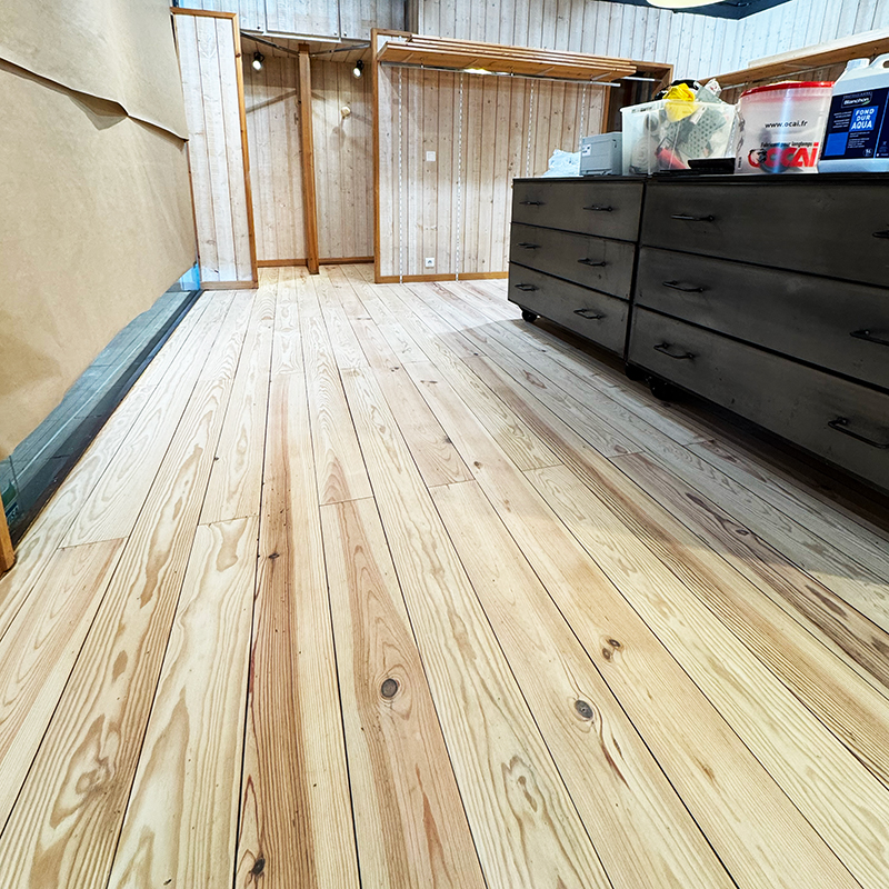 Rénovation plancher bois Rénovation plancher bois pour Sabine O. au Cap Ferret Plancher en pin maritime. Ponçage complet du magasin, dépoussiérage complet, application d’un fond dur et de deux couches de vitrificateur bicomposant aspect naturel mat. Passage extrême (magasin). J’AI UN PROJET SIMILAIRE, ON EN PARLE !