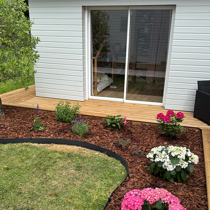 Terrasse bois Réalisation d’une terrasse bois pour Virginie L. à Montrem Terrasse en bois, lames en pin autoclave CL4 marron, bombées avec bords bisotés, posées sur des lambourdes en bois autoclave CL4 et plots béton. Par terre de fleurs en composite et d’écorces de pin maritime français. J’AI UN PROJET SIMILAIRE, ON EN PARLE !
