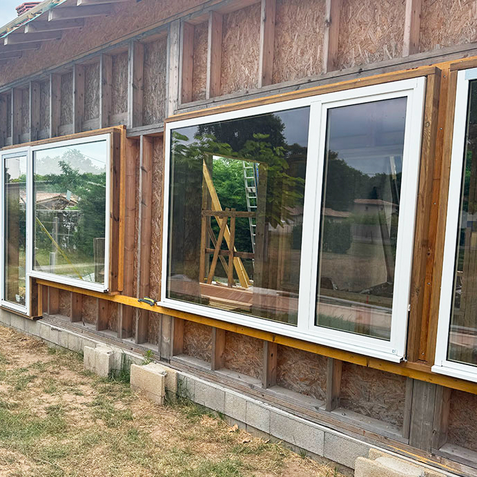 Pose menuiseries extérieures Menuiseries extérieures Pierre C. au Teich de Buch Menuiseries du fournisseur Minco, via le réseau Twiza. Menuiseries mix, pin intérieur, alu extérieur (RAL blanc 9016 satiné) Pose en tunnel, dans ossature bois épicéa, au nu extérieur de l’isolation extérieure pour un meilleur ensoleillement. Baie vitrée « accordéon » donnant sur le futur espace véranda. J’AI UN PROJET SIMILAIRE, ON EN PARLE !
