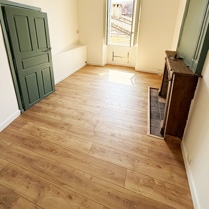 Pose d’un revêtement de sol stratifié Pose d’un revêtement de sol stratifié pour Fred D. À Périgueux Application d’un primaire d’accrochage sur un ancien plancher en bois, après dépose d’un jonc de mer. Entourage de la cheminée et seuils de porte en chêne massif, sur mesure, qui sert également de coffrage au futur ragréage. Ragréage P3 fibré, sur l’ensemble de la surface pour rattraper les aspérités. Pose de la sous-couche et du revêtement de sol, passage intensif imitation chêne naturel, pose des plinthes avec finition joint acrylique. J’AI UN PROJET SIMILAIRE, ON EN PARLE !