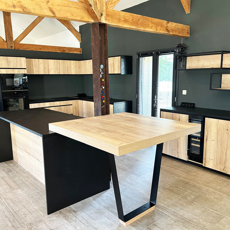 Pose cuisine équipée Cuisine de Céline et Jordi G. à Trélissac Pose d’une cuisine équipée, avec îlot central et plan snack, électroménager complet, cave à vin intégrée. Plans de travail stratifiés, façades mélaminées imitation chêne industriel, et poignées invisibles noires. Niches décoratives style industriel. J’AI UN PROJET SIMILAIRE, ON EN PARLE !