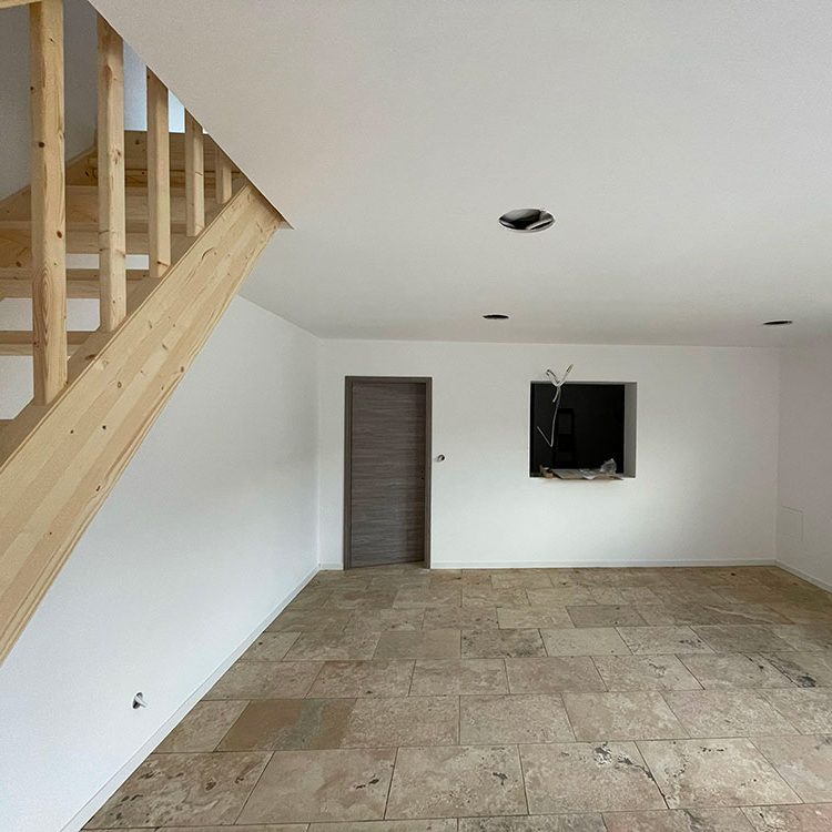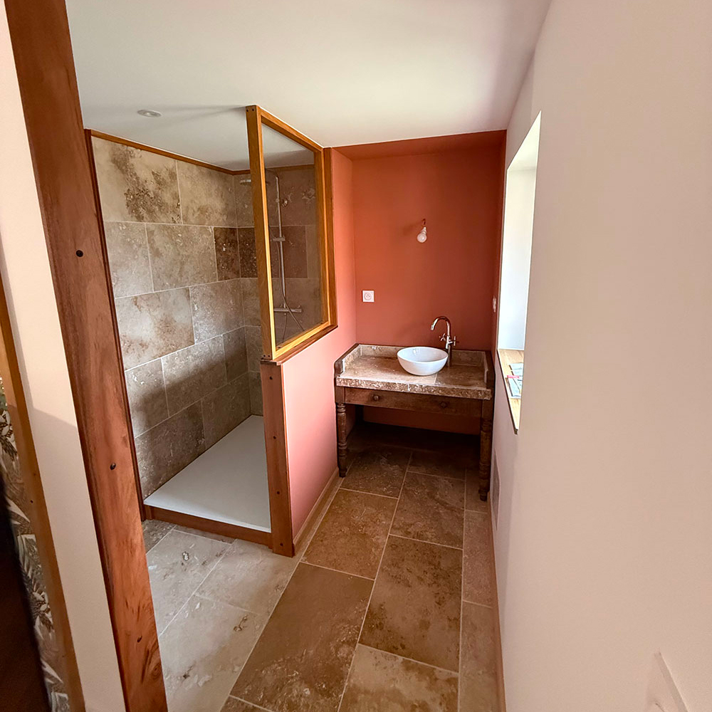 Rénovation d’une dépendance en pierre Doublage, isolation et aménagement à St Astier Doublage en ossature bois, 75 x 45 mm épicéa CL2, isolation en fibre de bois de 60 mm, membrane hydro-variable. Finition en plaque de plâtre 13 mm (BA13). Isolation des combles perdus en fibre de coton, sur 300 mm d’épaisseur. Pose du travertin au sol, après un ragréage de l’ensemble pour harmoniser les surfaces. Application d’un hydrofuge mat naturel sur l’ensemble. Pose de plinthes en plaquage chêne, finition joint acrylique Aménagement de la salle de bain, création d’une cloison en bois exotique et des nez de cloisons en bois exotique également. Pose du travertin en faïence, après application d’un enduit d’étanchéité sur l’ensemble de la partie en eau. Remise en état et transformation d’une ancienne coiffeuse pour en faire un meuble de salle de bain, recouvert de travertin pour harmoniser l’ensemble, pose de la vasque et du robinet. Bandes des plaques de plâtre, préparation et peinture : KODECO J’AI UN PROJET SIMILAIRE, ON EN PARLE !