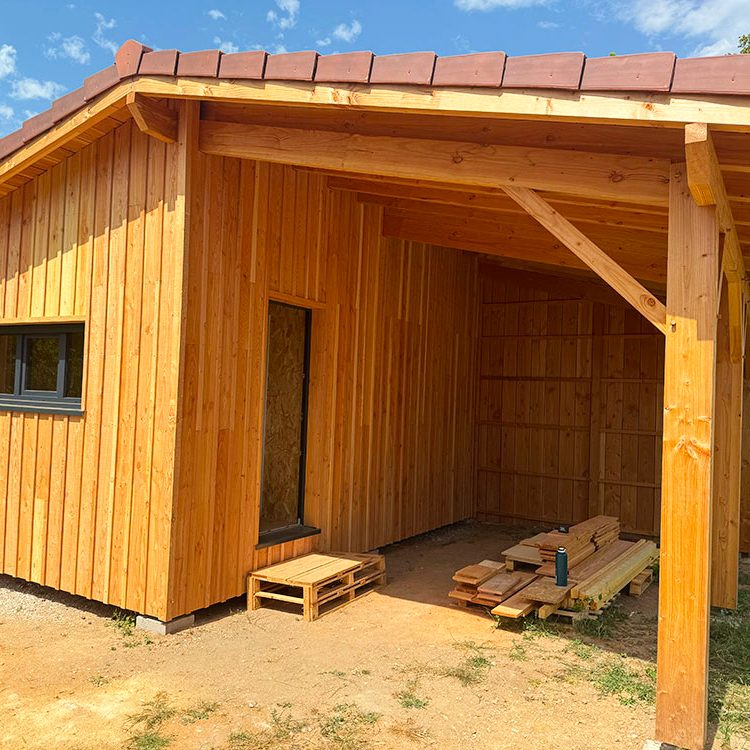 Carport bois et séchoir à plantes ossature bois Carport bois et séchoir à plantes pour Laëtitia et Olivier M. à Saint-Michel-de-Double Structure en poteaux – poutres Douglas naturel Charpente en Douglas naturel Volige en Douglas naturel Couverture en tuiles Mécanique ESCANDELA Gouttières et descente d’eaux pluviales en zinc Dalle en bois, ceinture en lamellé collé épicéa, solives en poutres techniques « poutres I », isolation en fibre de bois de 200 mm, plancher OSB3 22 mm Ossature bois en épicéa de 145 mm, isolation en fibre de bois de 145 mm, membrane d’étanchéité hydro-variable, finition intérieure et contreventement en panneau d’OSB3 de 12 mm. Menuiseries de chez Ouvéo Menuiseries, en PVC gris anthracite (RAL 7016), double vitrage, volets roulants. Bardage et palissade en douglas naturel, pose « Cap Ferret » avec couvre-joints, pose à la pointe inox crantée apparente J’AI UN PROJET SIMILAIRE, ON EN PARLE !