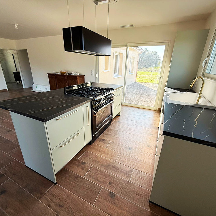 Pose d’une cuisine équipée Cuisine de Raphaëlle et Gaëtan V. À Mussidan Pose d’une cuisine équipée dans une maison neuve, avec îlot central, piano de cuisson, évier timbre. Plan de travail stratifié, façades mélaminées vert d’eau et poignées en laiton. Partenaire : Eco Cuisine / Espace et Style à Boulazac J’AI UN PROJET SIMILAIRE, ON EN PARLE !